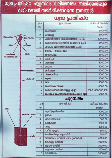 ഇതിനോടൊപ്പം ചുറ്റമ്പലം, വലിയമ്പലം, മുളയറ തുടങ്ങിയവയുടെ ഭാഗങ്ങള് ഭക്തജനങ്ങള്ക്ക് വഴിപാടായി സമര്പ്പിക്കാവുന്നതാണ്.